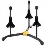 Support compact triple pour 2 trompettes ou cornet et pour un bugle, cônes velours et pieds pivotants, livré avec housse (poids : 1.2 kg, taille replié : 32 x 19 cm).